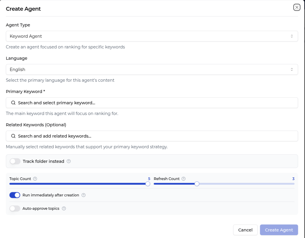 If enabled, as soon as you create the agent it will start generating the first set of blog topics (or blogs if auto-approve is enabled) and content refreshes |
