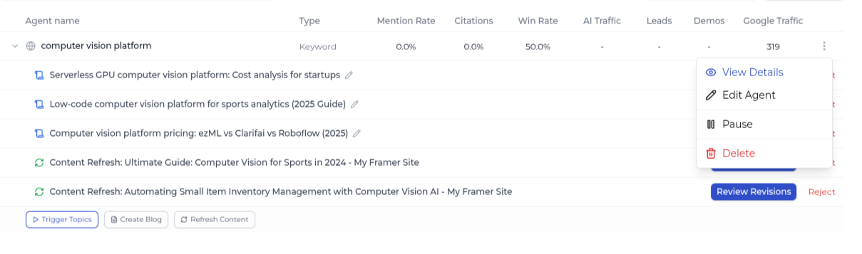 - Custom Action Buttons: By default the agent will be triggered every week, but if you want to trigger certain actions on-demand you can click on either "Trigger Topics", "Create Blog", or "Refresh Content".