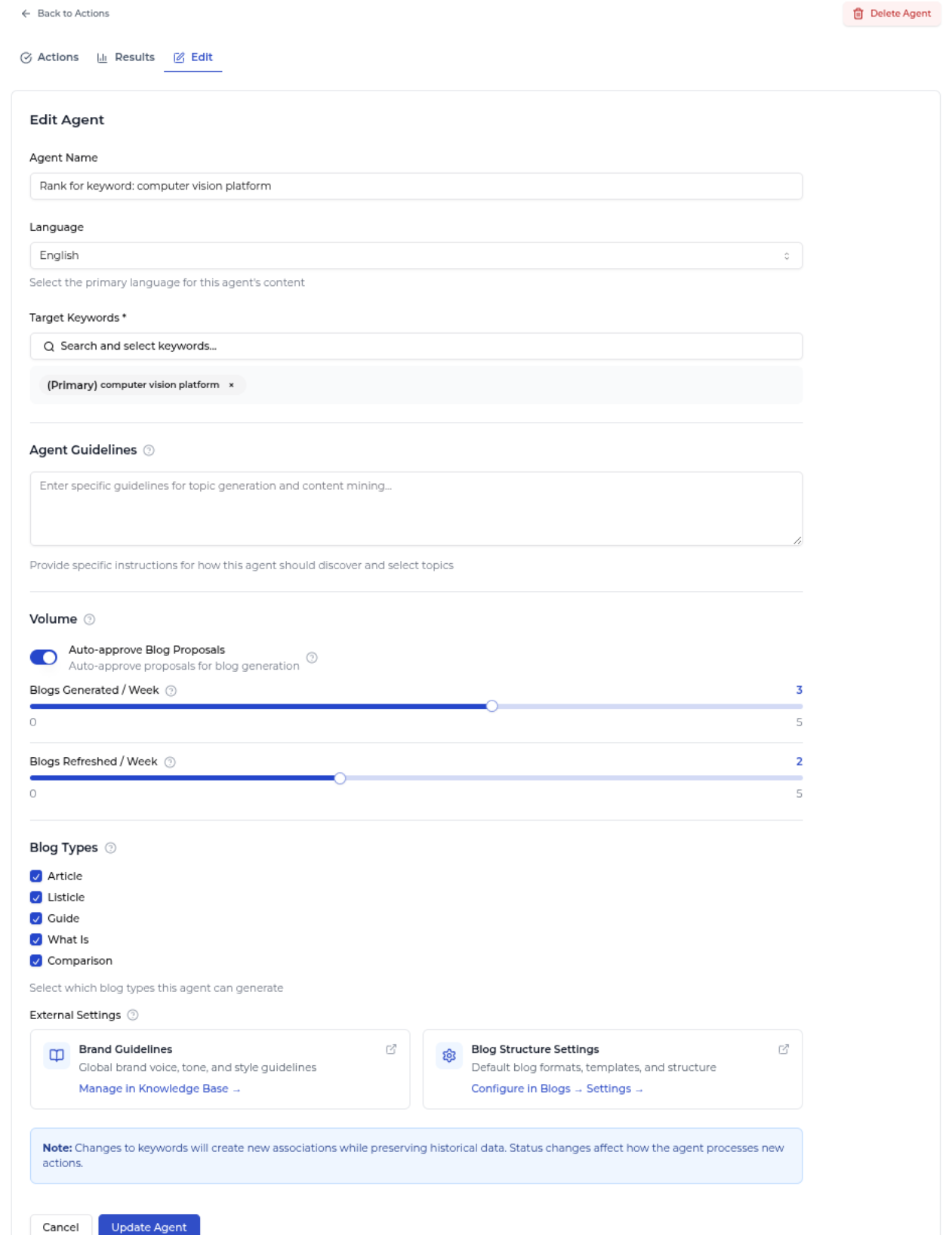 | Trigger Topics | Trigger proposing X number of topics right now for that agent's goals. (Skips to blog creation if auto-approve is enabled)