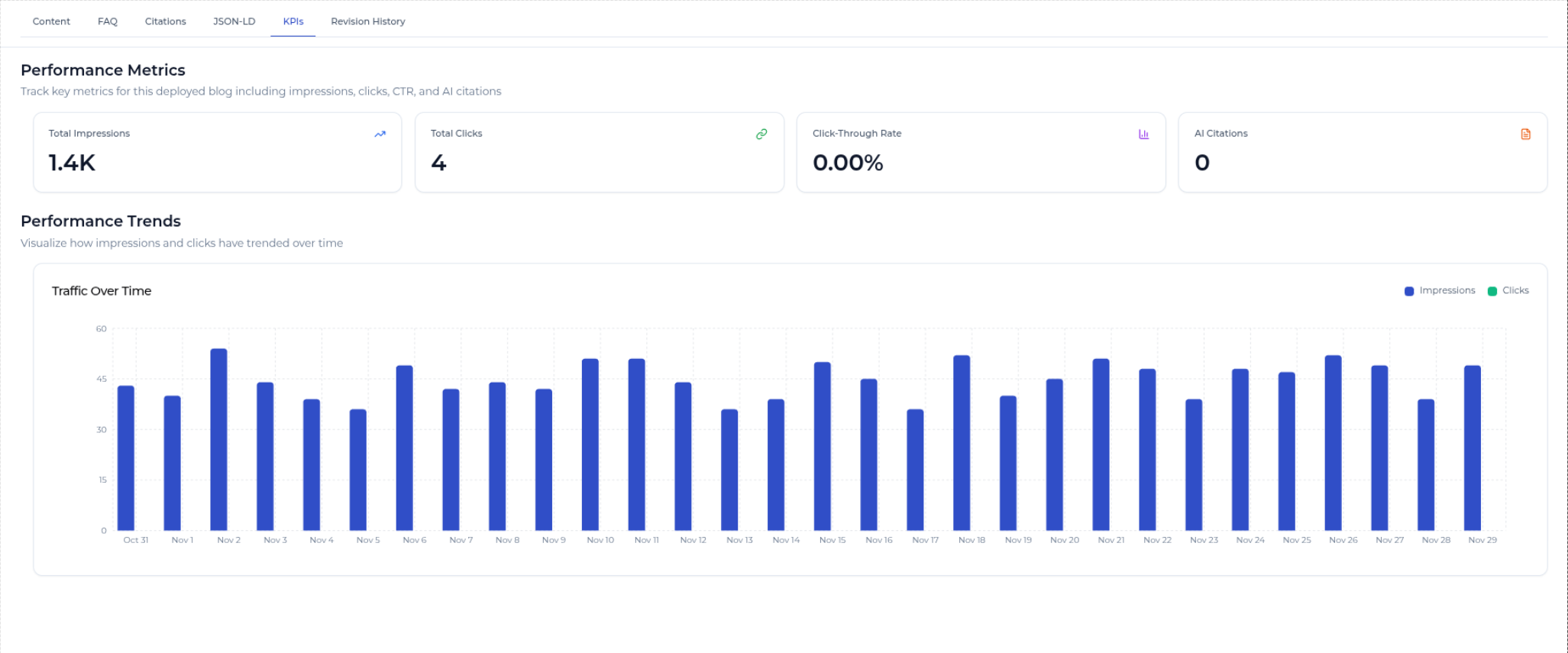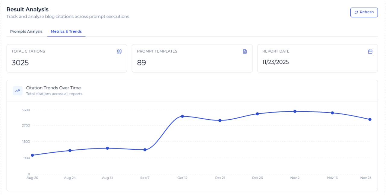 - Metrics & Trends Tab: Shows a graph of the AI citations of our blog posts over time