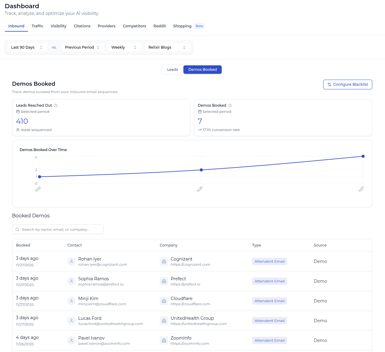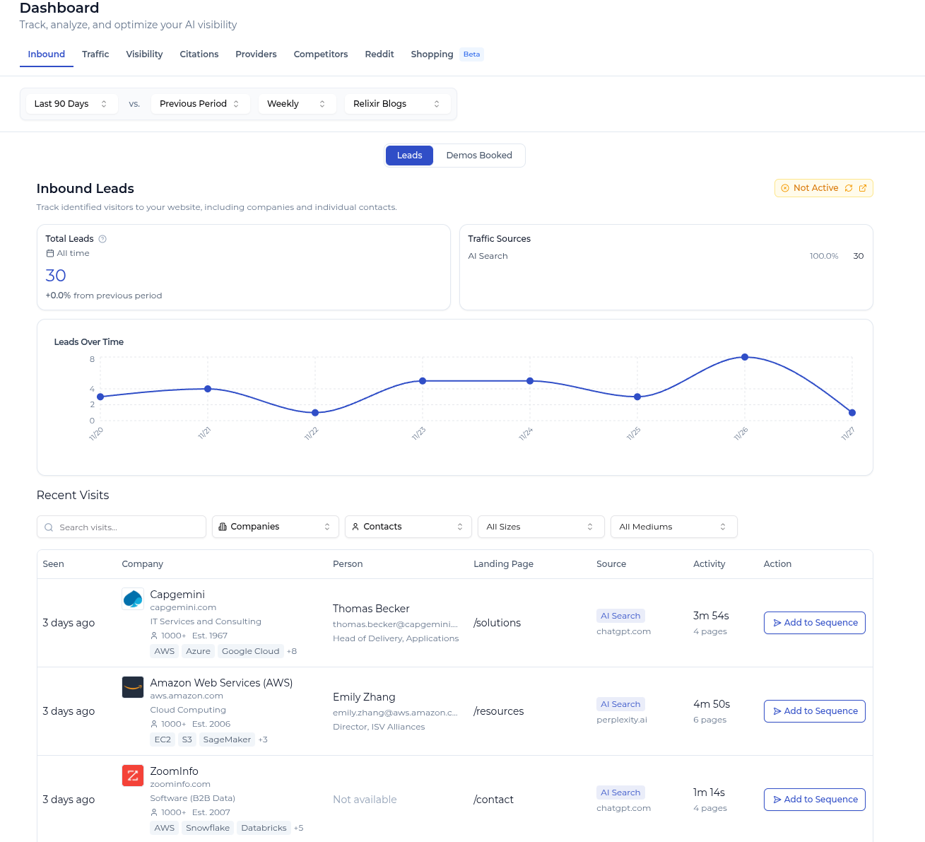 - Inbound Leads: Using visitor id, and our add-on email sequencing service. We can convert website visitors from AI search, directly into demos booked for your company.
