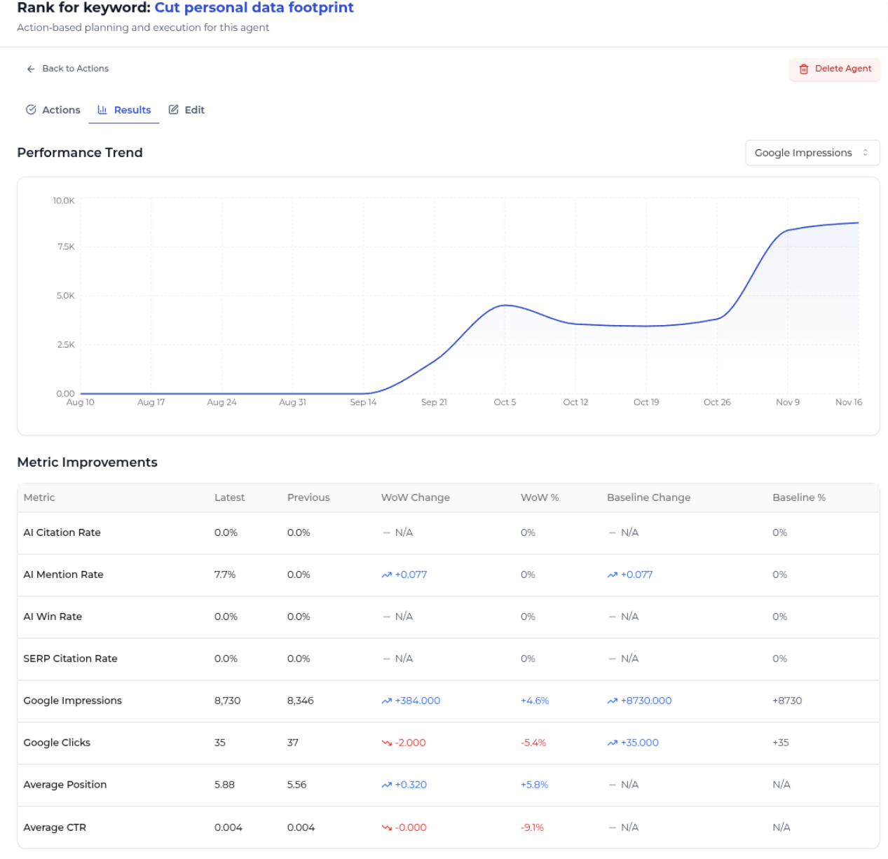 - Click into individual Agent page > Results tab — Shows granular KPI improvement for the selected Agent's actions and goals