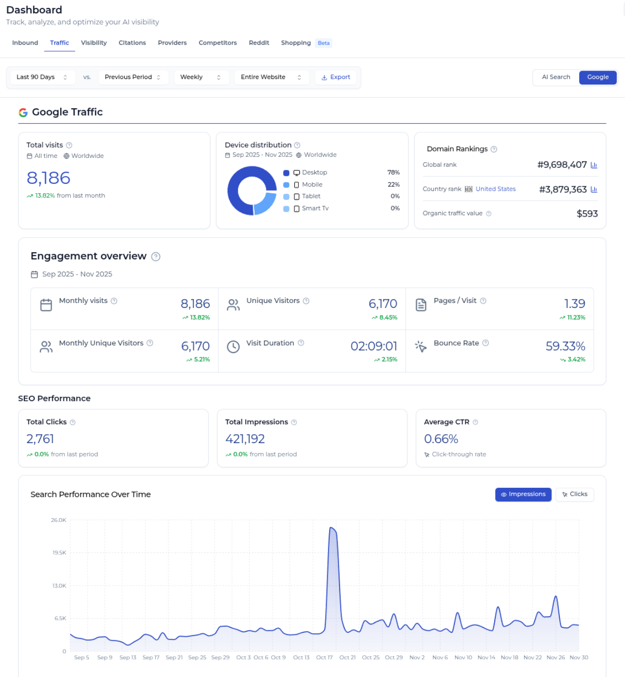 - AI + Google Search Traffic: Birds-eye view on traffic trend to website overall & from AI search