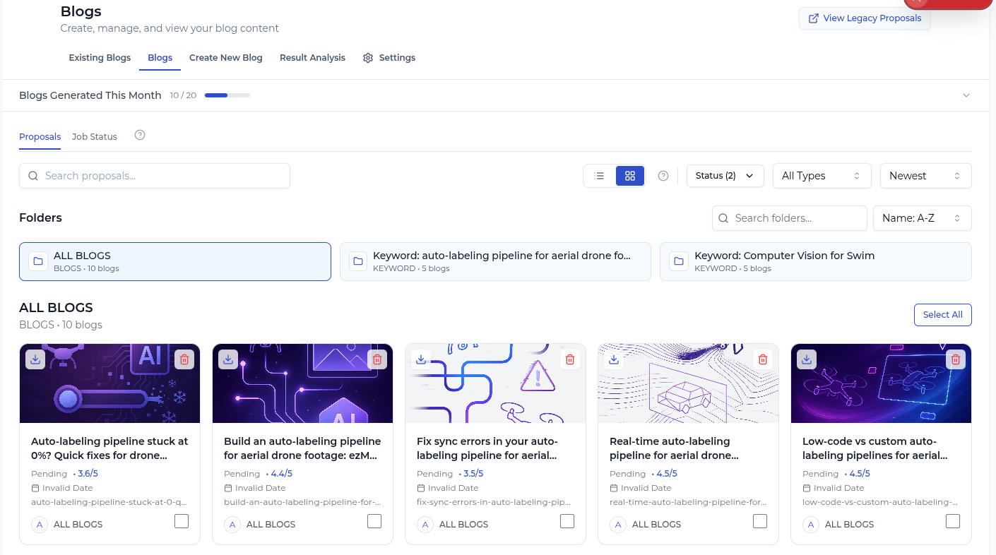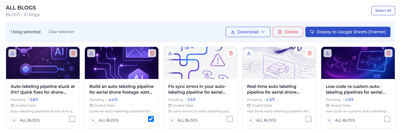 You can either click on the little check box in the bottom right of the blog post cards, or click into the blog itself to review it.